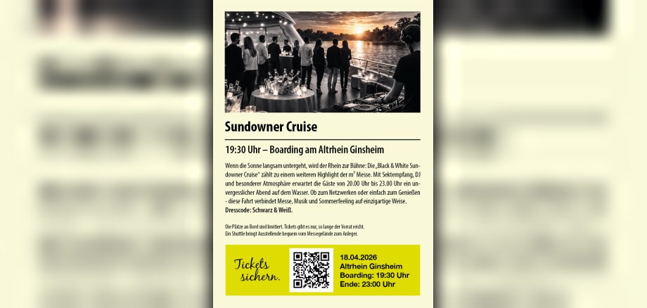 Als besonderer Programmpunkt der Veranstaltung „m³ - mehr als eine Messe“ wird eine stimmungsvolle Abendveranstaltung auf dem Rhein angeboten. Die exklusive Schifffahrt am Samstag, 18. April 2026 bietet ab 19.30 Uhr (Boarding) bis ca. 23.00 Uhr Gelegenheit, das Messegeschehen in entspannter Atmosphäre ausklingen zu lassen.