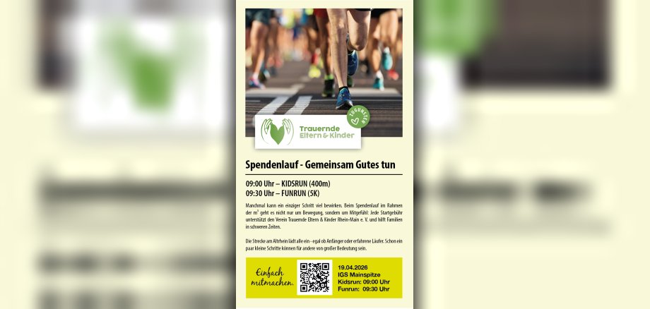 Im Rahmen der Messe „m³ – mehr als eine Messe“ lädt der Gewerbeverein Ginsheim-Gustavsburg am Sonntag, 19. April 2026, zu einem besonderen Spendenlauf ein. Unter dem Motto „Laufen für den guten Zweck“ verbindet die Veranstaltung sportliche Aktivität mit sozialem Engagement. Sämtliche Teilnahmegebühren kommen vollständig dem Trauernde Eltern & Kinder Rhein-Main e. V. zugute, der Familien in schweren Lebenssituationen begleitet und unterstützt. Darüber hinaus sind zusätzliche Spenden herzlich willkommen.