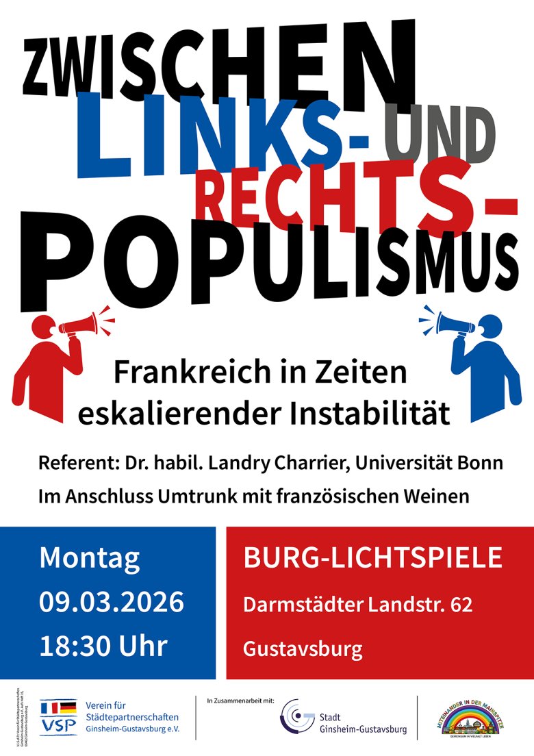 Einen spannenden Vortrag gibt es am Montag, 9. März, um 18.30 Uhr in den Burg-Lichtspielen: Der Politikwissenschaftler Landry Charrier beleuchtet dort unter dem Titel „Zwischen Links- und Rechtspopulismus: Frankreich in Zeiten eskalierender Instabilität" die aktuelle Lage in unserem Nachbarland. Dabei wird er auch auf Parallelen und Unterschiede zur Situation in Deutschland eingehen.