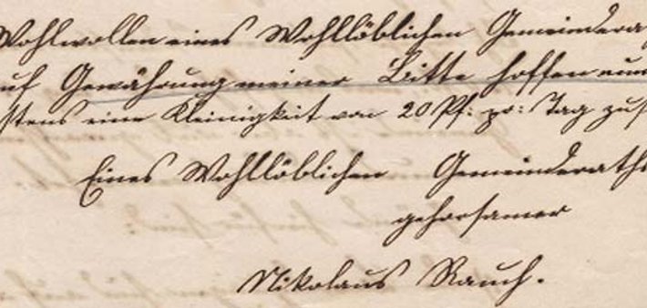 Am 29. Dezember 1886 schreibt der Ginsheimer Glöckner Nikolaus Rauch an den wohllöblichen Gemeinderat zu Ginsheim. Er entschuldigt sich vorab, dass er während seiner dreißigjährigen Dienstzeit den Gemeinderat noch nie mit einer Bitte belästigt hat. Er ersucht um geneigte Bewilligung einer Zulage zu seinem Gehalt, das seit seinem Dienstantritt rund 150 Gulden beträgt. Nur ungefähr 70 Pfennige seien das pro Tag, wo doch die Gemeinde in all den Jahren „viel gewachsen“ und größer geworden ist. Nikolaus Rauch führt sein Gründe an: Die Beerdigungen sind auf das doppelte angewachsen, das Taufgeschirr muss neuerdings getragen werden, so auch bei Nottaufen. Früher hatte ihm jeder Ortsbürger einen Leib Brot zu geben, dann erfolgte die Umwandlung in eine Abgabe von 10 Kreuzer. Dies reiche aber nicht, koste doch ein Leib Brot nunmehr 17 Kreuzer. Das ganze Jahr über ist seine Pflicht, viermal täglich zu läuten und die Kirchenuhr aufzuziehen. Wöchentlich ist die Kirche zu reinigen, weil der Weg davor nicht gepflastert ist. Trotz der Tatsache, keinen einzig freien Tag im Jahr zu haben, verweist ein „dem Gemeinderat gehorsamer Nikolaus Rauch“ auf seine gewissenhafte Pflichterfüllung all die Zeit und bittet um Gewährung „wenigstens einer Kleinigkeit von 20 Pfennigen pro Tag“ mehr. Ob er sie bekommen hat, die erhoffte Gehaltserhöhung?