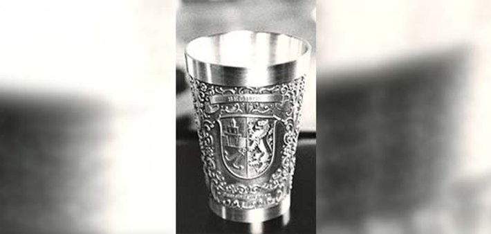 Kurz vor dem Osterfest 1981 präsentieren Bürgermeister Gottlieb Brunner und Hauptzweigstellenleiter Köhler von der Kreissparkasse Groß-Gerau das erste Exemplar des „Ginsheim-Gustavsburger Bechers“. Hergestellt in einem sehr aufwändigen Verfahren aus lebensmittelechtem Reinzinn mittels einer künstlerisch gestalteten Kokille1, zeigen die Oberflächen im Relief das Wappen von Ginsheim-Gustavsburg, eine Altrheinpartie mit der Ginsheimer Kirche und die Abbildung eines Merian-Stiches der schwedischen Festungsanlage Gustavsburg aus dem Jahr 1632. Von dem Verkaufspreis in Höhe von 32,- DM fließen je verkauften Becher 1,50 DM als kulturelle Spende dem Jugendzentrum Ginsheim-Gustavsburg zu, das seit 1979 sich in von der Gemeinde angemieteten Räumen an der Gemarkungsgrenze zu Bischofsheim im Aufbau befindet.