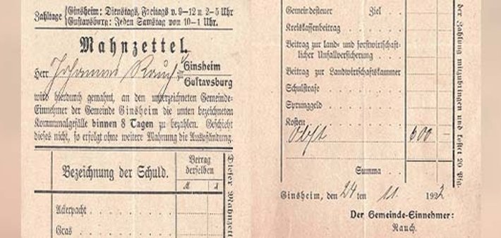 Zu Zeiten, in denen an Banküberweisungen nicht zu denken ist, geht der Gemeindeeinnehmer im Ort von Haus zu Haus, um Gebühren und Steuern zu erheben1 und der Gemeindekasse zuzuführen. Im Jahre 1903 beträgt das Jahresgehalt 1500 Mark einschließlich der Kranken- und Invalidenversicherung, 1919 gewährt der Gemeinderat einen Telefonnebenanschluss an die Bürgermeisterei und 1920 ein eigenes Büro im Ginsheimer Rathaus. Dort bereitet Einnehmer Rauch Mahnzettel2 für säumige Bürgerinnen und Bürger vor, zum Beispiel für Ackerpacht, Gemeindesteuer, Beitrag an die Landwirtschaftskammer, Schulgelder, Sprunggeld und – siehe Bild - für den Bezug von Obst aus den Streuobstwiesen der Gemeinde.