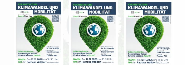 Veranstaltungshinweis: Klimawandel und MobilitätDie Kommunale Arbeitsgemeinschaft Zukunft Rhein-Main (KAGZRM) lädt für Mittwoch, 12. November 2025 um 18:30 Uhr zur öffentlichen Veranstaltung „Grüne Horizonte – Nachhaltiges Reisen für eine bessere Zukunft“ in den Stadtverordnetensitzungssaal des Rathauses Walldorf (Flughafenstraße 37, 64546 Mörfelden-Walldorf) ein. Der Verkehrssektor – insbesondere der Flugverkehr – trägt in erheblichem Maß zum Klimawandel bei. Im Zentrum des Abends steht daher die Frage, wie Mobilität künftig so gestaltet werden kann, dass sie sowohl klimafreundlich als auch tragfähig bleibt. Für diese hochaktuelle Thematik konnten zwei renommierte Experten gewonnen werden: Dr. Tim Staeger, ARD-Meteorologe und Klimaexperte, sowie Frank Herrmann, Sachbuchautor und Fachmann für verantwortungsvollen Tourismus. Beide präsentieren mit ihren Impulsreferaten wissenschaftliche Fakten und geben Denkanstöße, wie eine nachhaltige Zukunft des Reisens aussehen kann. Im Anschluss an die Vorträge diskutieren Expertinnen und Gäste gemeinsam unter anderem darüber, welche klimafreundlichen Alternativen im Reiseverhalten heute schon existieren, wie Mobilität neu gedacht werden kann, ohne auf Lebensqualität zu verzichten, und wie Verantwortung für nachhaltiges Handeln aussehen kann. Auch erfolgreiche Beispiele aus der Praxis sollen vorgestellt und gemeinsam reflektiert werden. Die Veranstaltung bietet zudem Raum für Austausch: Beim anschließenden Get-Together mit kleinem Imbiss haben Teilnehmende Gelegenheit, sich zu vernetzen und Gespräche zu vertiefen. Die KAGZRM versteht sich als Forum flugverkehrsbezogene Themen im größeren gesellschaftlichen Zusammenhang zu beleuchten. Ziel ist es, durch Veranstaltungen wie diese sachlich, transparent und öffentlichkeitswirksam zu informieren. Zur besseren Planung wird um kurze Rückmeldung zur Teilnahme an kagzrm@kreisgg.de gebeten. |