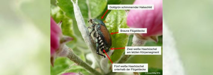 Eine Befallszone von 1 km und eine angrenzende Pufferzone mit einem Radius von 6 km um die Fundstellen wurden eingerichtet. In der Pufferzone ist es verboten, Pflanzen, Grünschnitt und Erde außerhalb dieser Zone zu verbringen. Da ein Großteil des Stadtteils Ginsheim in diese Pufferzone fällt, dürfen ab sofort die genannten Abfallarten nicht mehr von dort zum Recyclinghof oder zu anderen Grünannahmestellen wie etwa zum Sonnenwerk nach Bischofsheim transportiert werden. Die Biomülltonne wird weiterhin im entsprechenden Rhythmus eingesammelt. Es ist darauf zu achten, dass nur kleingehäckseltes Material (kleiner als 5 cm) oder mit dem Mäher ausreichend zerkleinerter Rasenschnitt in der Tonne entsorgt werden. Die sonstigen Gartenabfälle bittet die Stadtverwaltung bis auf Weiteres, voraussichtlich bis Ende September, im Garten zu lagern. Die betroffenen Kommunen arbeiten in Abstimmung mit dem Regierungspräsidium kurzfristig an einer Lösung für die Entsorgung von Grünschnitt aus der Kern- und Pufferzone. Ab Oktober fliegt der Käfer nicht mehr. Der Grünschnitt kann dann wieder unbedenklich entsorgt werden. Für Bodenmaterial aus den oberen 30 cm gilt jedoch ein ganzjähriges Verbringungsverbot. Für die Weitergabe von lebendem Pflanzenmaterial wie etwa Topfpflanzen oder aus dem gewerblichen Pflanzenbau gelten weitere Bestimmungen, die in den Unterlagen des Regierungspräsidiums nachgelesen werden können. In der eigentlichen Befallszone in Trebur gelten weitere strengere Regelungen. All diese Maßnahmen haben das Ziel, das Risiko einer Ausbreitung zu minimieren und die erheblichen Schäden, die der Käfer verursachen kann, einzudämmen. Der Pflanzenschutzdienst Hessen bittet zudem die Bevölkerung um Unterstützung. Käfer, auf denen die Merkmale des Japankäfers zutreffen, sollen gefangen und fotografiert werden. Die Fotos können mit Angabe des Fundortes per E-Mail an psd-pflanzengesundheit@rpgi.hessen.de geschickt werden. Die Bilder werden dann von den dortigen Fachleuten ausgewertet und bei positivem Befund abgeholt. Ausgewachsene Käfer sind mit 1–1,5 cm etwas kleiner, als eine 1-Cent-Münze. Sie sind metallisch-grün gefärbt und haben kupferfarbige Flügeldecken. Der Japankäfer ähnelt dem Gartenlaubkäfer, unterscheidet sich von diesem durch 12 weiße, behaarte Punkte am Hinterleib (je 5 seitlich und 2 größere Punkte am Hinterende). Die Japankäfer fliegen von Juni bis September. Die Weibchen legen ihre Eier im Boden ab. Die Larven ernähren sich vor allem von Graswurzeln, die erwachsenen Käfer von Blättern, Früchten und Blüten. Er ist sehr gefräßig und schädigt über 300 unterschiedlichste Pflanzenarten. Weitere Informationen erhalten Sie über die Website https://pflanzenschutzdienst.rp-giessen.de/pflanzengesundheit/amtliche-erhebungen/der-japankaefer-popillia-japonica/